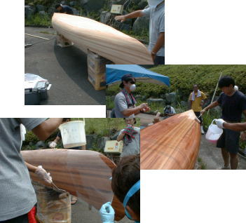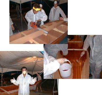 | ほろ酔い気分もここまで。 國明師匠は一足早くカヌー作りの現場へ。 外側のFRPも乾き、いよいよストロングバッグを外します。 筆おろしのハスク346XPを片手に、國明師匠が 記念すべきカットを行ないます。 その後國明師匠の勢いは益々パワーアップし、 一気に内側のFRPを塗り上げてしまいました。 文化放送のスタッフもいつのまにか流れに巻き込まれ 隣の2艇もFRPを塗り終えてしまいました。 ふと時間を見てみると、夜中の12時30分。 やっぱり今年も夜中になってしまった! |