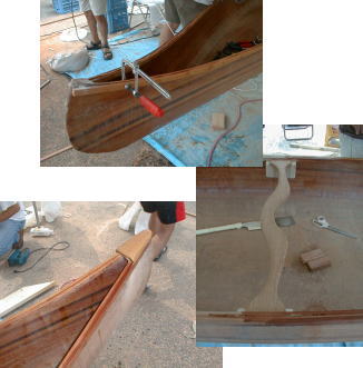 ガンネル貼りが終ると同時に 栗田先生の椅子作りが始まりました。 得意のチェーンソーでオリジナルの 可動式の椅子をつくってくれました。 この頃になると最後の追い上げのはずなのに 何故かみんなに疲れの色が出てきました。 進水式は午後3時。 間に合うのでしょうか? 椅子の後ろには補強をかねた背もたれ を付けて完成です。 さあいよいよ進水式。 |