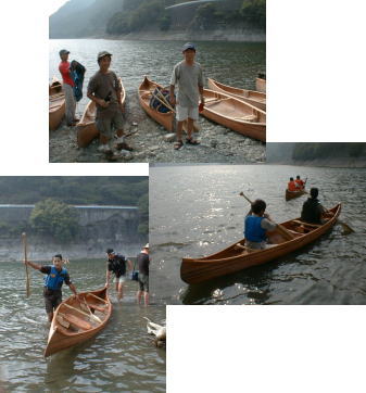 | 國明師匠の掛け声で完成のシャンパンが 開けられ、まずは生ビールで乾杯です。 今回は記念して、初参加の栗田先生が 國明師匠と進水式を行いました。 栗田先生は、乗船前に、全て身につけてるものを みんなから剥ぎ取られ、訳もわからず 湖に出ていったのです。 そして数分後、見事にお約束の「沈」。 不意を突かれた栗田先生は 「そう言うことだったのか〜」と苦笑い。 我々も次々と乗りこみ、 熱い体を湖で冷やして帰ってきました。 こうやって、今年のカヌーキャンプも 全6艇が無事進水式を迎え、終了したのであります。 |