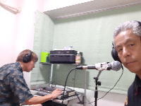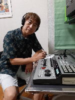 最後に到着したのが大極君。 以前にも村井君とのアレンジで村井宅を訪れては、ベースやギターのフィルインを入れたりしていたが、 今回は残されたセカンドボーカルとベース、そして全体バランスの調整。 |