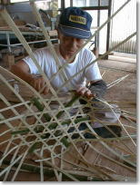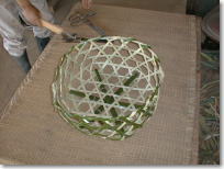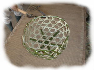 | じいさんが編みこんでるところです。 ここからは側面の編み込みです。 均等に丸みをつけるには 最初に削った竹材の厚みが 均一でなければ、 綺麗な丸型にはなりません。 |