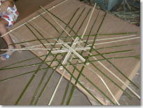 中心が六角形になるように 6本の竹を編みこみます。 その六角形を全部で 18本分編んだら 底面の出来あがりです。 |
