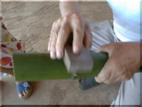 今こそホームセンターで竹割の 冶具が売っていますが、 このやり方は代々行なわれて きた方法です。 まず裂け目を入れた竹の一方に 一本の棒を挟みます。 |
