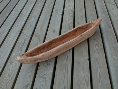 | ミニカヌー(3月5日新作) 丸太のプランターを作った後の端材で作った 切りだしのカヌー。ノアの箱舟のようでしょ。 |