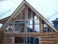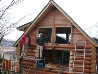 12月 妻壁も貼り終わりました。 ログハウスっぽくなりました。 完成まであと少し。 |