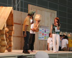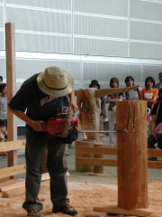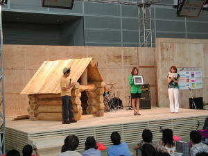最後は自然暮らしの会全員で、ステージ上に15分でミニログハウスを組み上げました。もちろんこのミニログハウスもオークションとして出品されました。