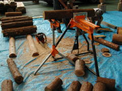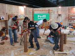 ドゥーパと共同出展のブースはオーストラリア製「トリトン」のツールとの競演です。ログワークも出来るトリトンのツールは、みんな感動モノでした!早速間伐材でログチェア作り。