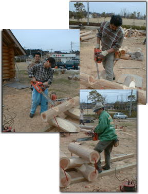 アウトドアフェスティバルが開催される一週間前の日曜日、自然暮らしの会のいつものメンバーと、國明師匠、栗田先生と共に展示用ログテーブル作りを行ないました。 となりで「鯉の川くだり」のカービングを作る國明師匠をチラチラと見ながら、我々は久しぶりのチェーンソーに快感を覚えながらもくもくとテーブルを作るのでありました。 力さん 「ウォら〜〜!やるぞ!」 大ちゃん 「ほんじゃ、ハーフカットやりましょか」 麦さん 「大ちゃん、朝から元気だよな〜」 しもヤン 「力さんも、ウップンたまってんじゃないの?」 カツオさん 「早くヤンないと雨降って来るっぺよ!」 てな感じで和気藹々と進むのでありました。 |