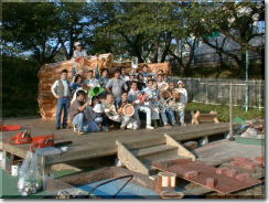 5月4日、ガーデニング班は エントランスの製作とデッキへの階段、 そしてBBQコンロの製作です。 隣のチェーンソーに負けず 劣らずの力作です。 |