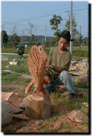 | 栗田師匠のカービングの妙技は一見の価値あり。まるで絵を書くかのように見る見るうちに刻んでいく様子は、見習の僕達をホウフツさせてくれます。 右の写真はものの15分ぐらいで作り上げてしまった「鷲」。僕はこの鷲を見習って小鳥のカービングに挑戦しましたが、ペンギンになってしまいました。 |