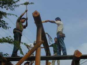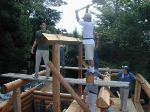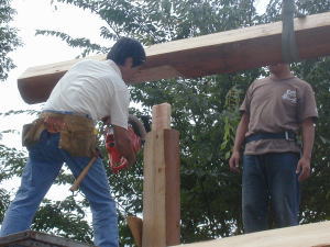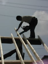ここでも栗田師匠の妙技、棟木上でのチェーンソーワーク。しかも片手でチェーンソーですよ!