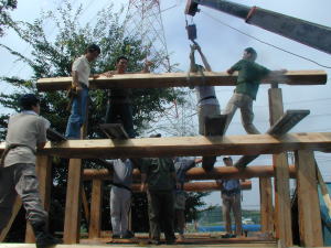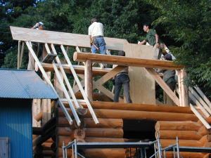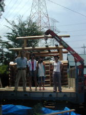 さあ、ユニックで棟木をポストまで上げますが、クレーンが届かないので、途中から人力で担ぎ上げます。