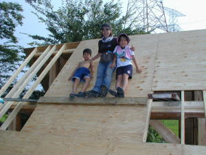 8月4日(日)棟上後二日目の作業は高橋ファミリーのみの応援で、野地板貼りです。