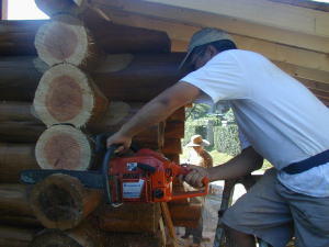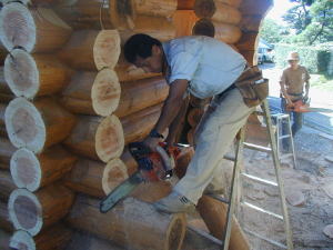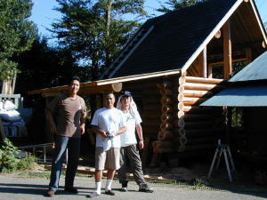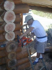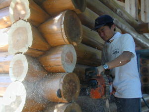 今日は久々に強豪メンバーの勢ぞろい。屋根貼り&ログエンドのカットです。