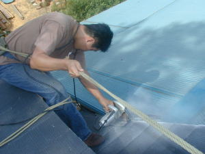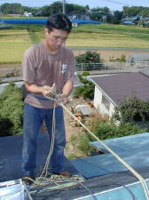 @まずは命綱を結んで、ドーマー側の屋根材のエンドのカットです。