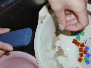 スポンジに浸して、ハンダ部分に塗り、丹念にこすります。これで、シックなステンドグラスの完成です。