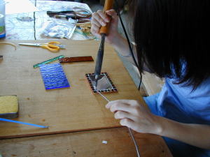 C銅線貼り : 洗浄して乾かしたガラスに、銅線を巻いていきます。