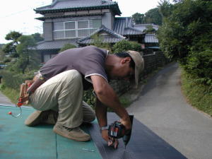 スターターから屋根勾配の合わせまで一気に貼ります。