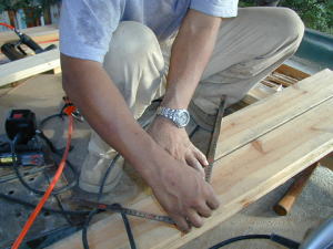 カツオちゃんからもらった2×6のサネ材を一枚ずつサイズを測って切っていきます。