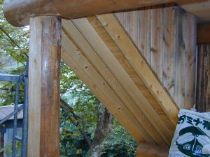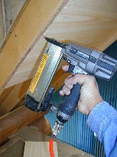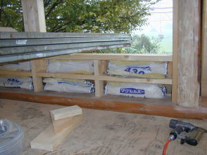 @前回やりのこした屋根の内張りは、母屋下の四隅なので、かがんでネイラー打ちを