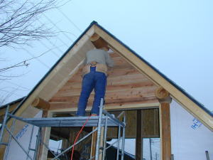 この棟木まで届く足場はホントに重宝します。(栗田師匠もうしばらくお借りします。)