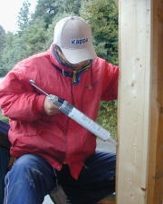 @まずは前回ツーバイ材で間仕切りした部分にコーキングです。