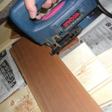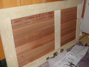 ドア枠は2×6、中はレッドシーダーのパネリングです。まずは枠の内側に溝を掘りました。