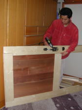 Eパネリングをジグソーでカットして、(マルノコが無かったので)ドア枠にはめ込んでいきます。