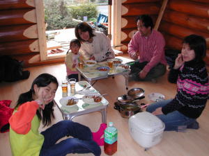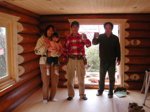 初めてログの中での昼食。思い起こせば、ここに座ったのは一年前の土台工事の時以来でした。