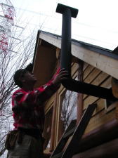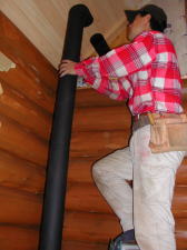 Gさあ煙突の取り付けです。ストーブ本体の煙突口にアルミテープを巻きつけて、煙突をはめ込みます。