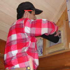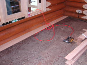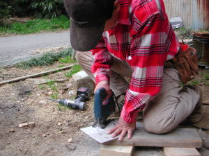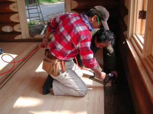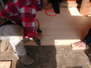 打ち付けていきます。充て木を添えて金槌でサネを収めます。