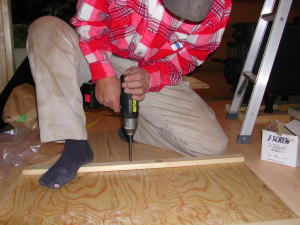 まずは煙突用の通し穴を作ります。ツーバイ材で囲いを作り、外側からマルノコでカット。
