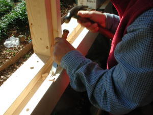 まずは建具に兆番用の溝を掘ります。マルノコで浅く刻んで、ノミで仕上ます。