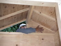 立ち上げた3枚のパネルを天井で固定します。これによりポストと棟木の補強代わりにします。