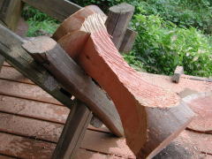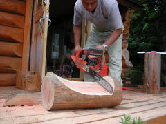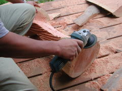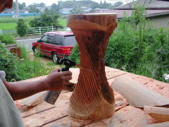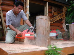 曲面にカットしたスタンドに、チェーンソーの刃でデザインをつけていきます。