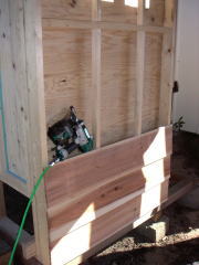 ツーバイで作った壁に外装材を貼るために間柱を打ち付けます。小屋を作ったときに余った垂木を使用しました。