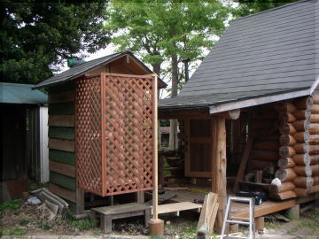 高さも高くログの軒先と屋根高が合わないため、扉を横向けに付けてあります。