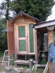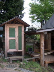 そこで、右の写真のように、一箇所だけ地面に柱を立て、その柱とトイレ本体に梁を取り付けました。