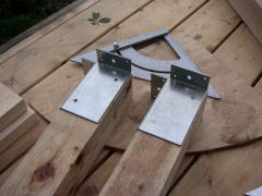 柱は杉材で3寸角。この柱に写真のアングルを取り付け、デッキの上に固定します。