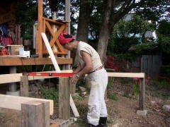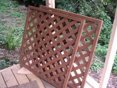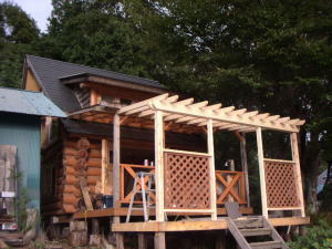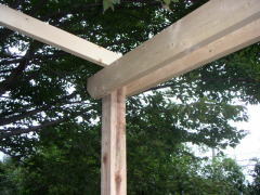 デッキの両端に角材を立て、ツーバイ材でパーゴラを作って行きます。
