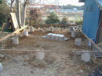 | 仮基礎 本来は水糸を張ったりしますが、ここでは簡単に4角の長さを芯と芯で結び、次に対角線の長さを計りこの対角線の長さが同一になるように調整します。そしたら各芯から芯ツーバイ材等を乗せ水平を決めます。 |