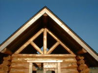 | ポスト(トラス) ルーフシステムの基礎となるのがトラスで、屋根の勾配により長さが変わります。仮にカネ勾配の場合、コードログの中心からプレートログまでの長さがポストの高さとなります。その上にホゾ加工された棟木が乗ります。棟木の天面は90度にカットしますが平面をできるだけ確保するために太くてテーパーの少ないログを選びます。 |