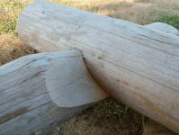 | シルログとハーフログ 基礎の上に乗せる最初のログ材で、半分にハーフカットされたログをハーフログと言い、約3分の1カットしたログをシルログと言います。これをそれぞれノッチ組みします。カット面はできるだけ平らにしておく事。そして裏側には芯(ノッチの中心)から内側に300mmの所に必ず逃げ墨をしておきます。 シルログとハーフログはログ作りで最初であり、かつ最後の作業です。 |