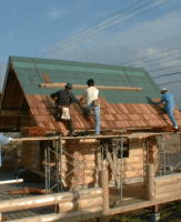 | 屋根 棟木とプレートログの上に垂木を乗せていきます。その上にコンパネ(野地板)を貼るため455mm幅で置いていきます。コンパネを貼ったらその上にルーフィングを屋根の下側から貼ります。最後に好みの屋根材をこれも下から貼っていきます。あとは破風板と鼻隠しを取り付ければ完成です。 |