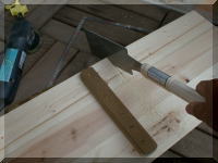 | 午前中の電動工具の音が ちょっと気になったので、 ここからは手鋸で勝負! まっすぐ切ってるつもりでも、 これが結構曲がってしまう。 もっと熟練が必要。 |