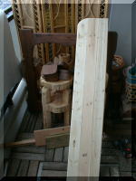左側が、今回の部材一式。 カウンター(写真下)は安い パイン材を3枚購入し、 貼り合わせて ジグソーとトリマーで コーナー処理をしました。 ちょっと柔らかすぎたかな? |