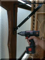 いよいよ最後の作業、 カウンター取り付け。 必ずレベルで水平を見ましょう。 ベランダは奥様の大切な作業場 でもあるので、テーブルは 折畳式にしました。 折りたたみ金具は1780円、 今回の中で一番高い部品でした。 |