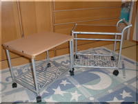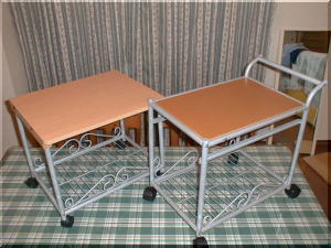 | 二つに切ったワゴン。 ひとつはキャスター付きだが 天板が無い。 もうひとつは天板はあるけど キャスターが無い。 ここからがベランダ工房の 腕の見せ所! |