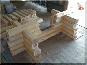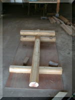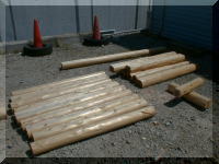 | @材料の選択 太鼓引きログの一番便利な所は、 ひとりで取り回せる事と、 高さが110mmで統一されているため、 スクライブしやすい事です。 長い順に材を並べ、 ラフで描いた図面を基に 無駄の無いように使っていきます。 |
