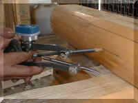 Bスクライブ 材を決めたら早速スクライブ作業です。 その前にプラムラインを 取りますが、手っ取り早い方法 として、近くの垂直な柱等を探し、 そこにプラムラインを引いてしまう方法が 良いと思います。 太鼓引きログは110mmサイズなので 基本的には5.5cmのスクライブとなります。 |